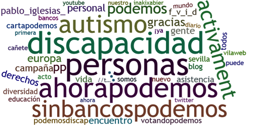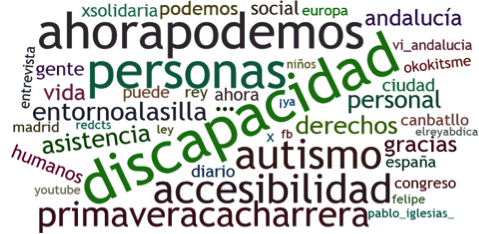 El derecho a la accesibilidad, de nuevo, se hace presente en los contenidos de los tweets. Lo mismo sucede con el autismo, que hace visible a la diversidad intelectual en este espacio concreto. En cualquier caso, no cabe duda que “discapacidad”, es la palabra y el hashtag más repetido, manteniendo la construcción dicotómica capacidad/discapacidad tan denunciada desde el MVI y que, para muchos, es generadora de discursos estigmatizadores.